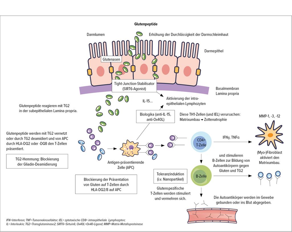 Abb. 1: Pathogenese der Zöliakie im Dünndarm und Ansätze für pharmakologische Therapieoptionen (modifiziert nach Schuppan D et al. 2025)2