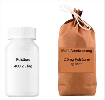Angesichts der oben genannten Limitationen der individuellen Supplementation rückt die Lebensmittelanreicherung in den Fokus. Seit 2023 empfiehlt die WHO explizit die Einführung von Anreicherungsprogrammen in allen Mitgliedsstaaten. Dies kann durch eine Anreicherung von Getreide oder Mehl erfolgen, mit dem Ziel einer zusätzlichen Folsäurezufuhr von 100–200µg/Tag. Rund 80 Länder haben diese Empfehlung bereits umgesetzt.7 Grossbritannien führte 2022 als erstes europäisches Land ein nationales Fortifikationsprogramm mit 2,5mg Folsäure/kg Mehl ein.