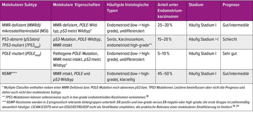 Für das Endometriumkarzinom hat sich im Zuge der WHO-Klassifikation der Tumoren 2020 eine molekulare Klassifikation etabliert, die ursprünglich nur für den endometrioiden histologischen Typ vorgesehen war. Diese molekulare Klassifikation wurde in den letzten fünf Jahren von namhaften wissenschaftlichen Organisationen wie der European Society of Gynecological Oncology (ESGO), der European Society for Radiotherapy and Oncology (ESTRO), der European Society of Pathology (ESP), der European Society for Medical Oncology (ESMO) und der International Federation of Gynecology and Obstetrics (FIGO) übernommen und in Empfehlungen und Richtlinien integriert.1–4 ESGO, ESTRO und ESP haben im vergangenen Jahr ihre gemeinsamen Empfehlungen wesentlich überarbeitet und verfeinert. Die molekulare Klassifikation wird dabei für alle Endometriumkarzinome empfohlen und sollte am besten im Zuge der Erstdiagnostik am Kürettagematerial erstellt werden. Die molekulare Klassifikation basiert ursprünglich auf den Ergebnissen des Cancer-Genome-Atlas-Projektes (TGCA), das mittels Next-Generation-Sequencing (NGS) vier prognostisch unterschiedliche Subtypen des Endometriumkarzinoms darstellen konnte. Die Anwendung von Surrogatmarkern hat die Untersuchung vereinfacht und praxistauglich gemacht. Die Klassifikation basiert auf folgenden Untersuchungen: Immunhistochemie mit Antikörpern gegen Östrogenrezeptoren, p53 und Mismatch-Repairproteine sowie eine molekulare Untersuchung auf pathogene Polymerase-E (POLE)-Mutationen. Basierend auf diesen Untersuchungen ergeben sich schließlich vier unterschiedliche Subtypen (Tab. 1). Mithilfe der Untersuchungen werden drei wesentliche Alterationen detektiert: eine Mismatch-Repair-Defizienz (MMRd) oder eine abnorme p53-Expression bzw. TP53-Mutationen und pathogene POLE-Mutationen. Fehlen diese drei Alterationen spricht man von „No specific molecular profile“(NSMP)-Karzinomen, die mit etwa 50% die größte Gruppe darstellen. NSMP-Karzinome werden auf Basis des Östrogenrezeptors und des histopathologischen Differenzierungsgrades in zwei Subgruppen unterteilt (Tab. 1). Der molekulare Typ hat eine wesentliche prognostische Aussagekraft, sagt aber auch das Ansprechen auf Therapieoptionen vorher. Dazu zählt insbesondere das Ansprechen auf eine Immuncheckpoint-Inhibition bzw. Therapie mit Immunonkologika bei MMR-defizienten und auch bei POLE-mutierten Karzinomen. P53-abnorme Karzinome sprechen wiederum gut auf eine Radio-Chemotherapie an, während diese bei POLE-mutierten Karzinomen kaum Wirkung zu zeigen scheint. Für Karzinome mit TP53-Wildtyp gibt es ebenfalls eine neue Therapie, speziell für fortgeschrittene Stadien und Rezidive.