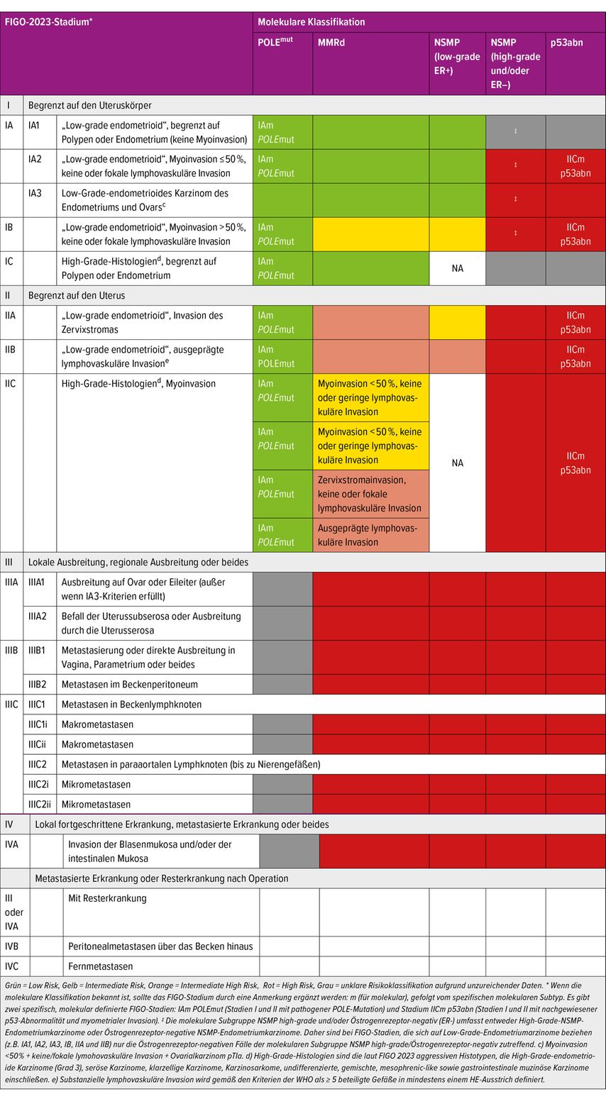 Die wesentlichsten Änderungen umfassen: die Einführung der konsequenten molekularpathologischen Diagnostik, die dem Rezidivrisiko angepasste Risikogruppen- Klassifikation mit entsprechenden adjuvanten Therapiestrategien, welche die Immuntherapie inkludieren. Die Kombination aus Chemotherapie und Immuntherapie ist ein Standard in der Therapie des fortgeschrittenen und rezidivierten Endometriumkarzinoms geworden. Ärzt:innen, die Patientinnen mit Endometriumkarzinomen behandeln, sollten die FIGO-2023-Klassifikation kennen, die Ergebnisse der molekularpathologischen Analysen interpretieren und die sich daraus ergebenden Therapiekonsequenzen ziehen können. Die neue ESGO-ESTRO-ESP-Leitlinie 2025 stellt hierbei eine enorme Hilfe dar.