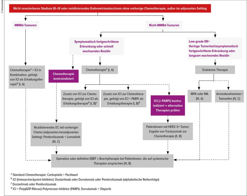 Abb. 3: Systemische Erstlinientherapie im inoperablen Stadium III–IV oder bei rezidivierendem Endometriumkarzinom ohne vorherige Chemotherapie, außer im adjuvanten Setting (einschließlich Patientinnen mit Resttumor nach Operation). EBRT = „external beam radiotherapy“, MA = Megestrolacetat, MPA = Medroxyprogesteronacetat