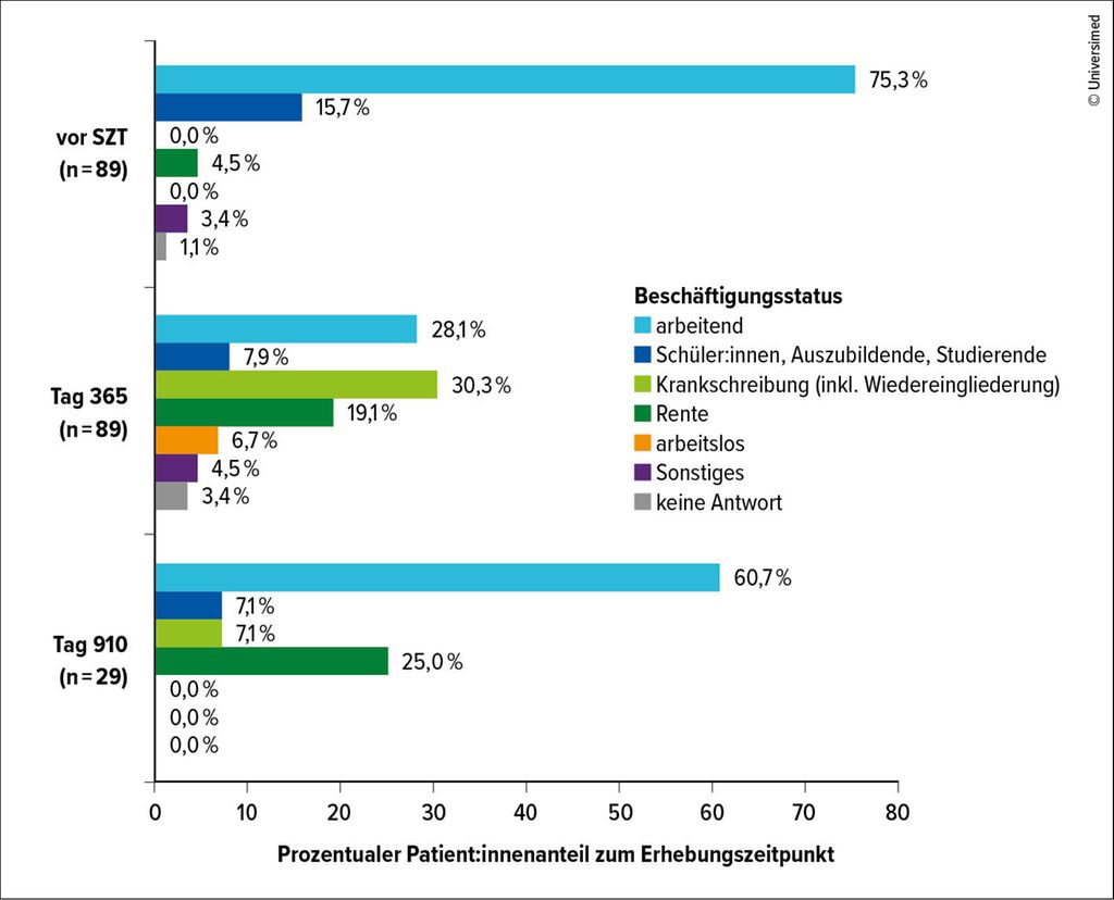 Abb. 2: Beschäftigungsstatus vor sowie 365 und 910 Tage nach Stammzelltransplantation (modifiziert nach Tandetzky L et al.)4
