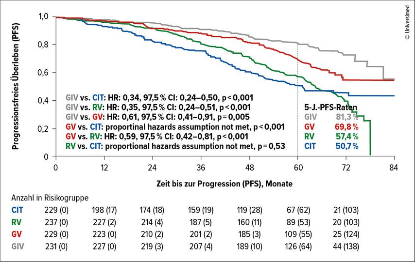 Primäre Studienendpunkte waren die Rate an nicht detektierbarer minimaler Resterkrankung (uMRD) im Monat 15 und das progressionsfreie Überleben (PFS). Dr. Moritz Fürstenau, Uniklinik Köln, präsentierte in der Best-Abstract-Sitzung beim DGHO die finale Analyse der CLL13-Studie mit einer medianen Nachbeobachtungszeit von 63,8 Monaten und einer medianen Nachbeobachtungszeit nach Behandlungsende von 54 Monaten.2 Die 5-Jahres-PFS-Rate lag im GIV-Arm mit 81,3% signifikant höher im Vergleich zu den anderen Studienarmen mit 69,8% (GV), 57,4% (RV) und 50,7% (CIT) (Abb.1). Das Risiko für einen Krankheitsprogress oder Tod wurde mit GIV um 39% gegenüber GV (HR: 0,61; p=0,005), 65% gegenüber RV (HR: 0,35; p<0,001) und 66% gegenüber CIT (HR: 0,34; p<0,001) reduziert. Als unabhängige prognostische Faktoren für das PFS wurden unter GIV die Trisomie 12 und der IGHV-Status, unter GV der Allgemeinzustand (ECOG PS ≥1 vs. 0) und der IGHV-Status, unter RV die B-Symptome, der Karyotyp und der IGHV-Status und unter CIT das Alter (>65 vs. ≤65), die Tumorlast, der Karyotyp und der IGHV-Status identifiziert. Eine Subgruppenanalyse bezüglich des IGHV-Status bestätigte den signifikanten Vorteil von GIV gegenüber allen anderen Regimen, während bei Patient:innen mit mutiertem IGHV der Vorteil gegenüber GV keine Signifikanz aufwies (5-Jahres-PFS-Rate: 89,1 vs. 82,9%; HR: 0,69; p=0,28).