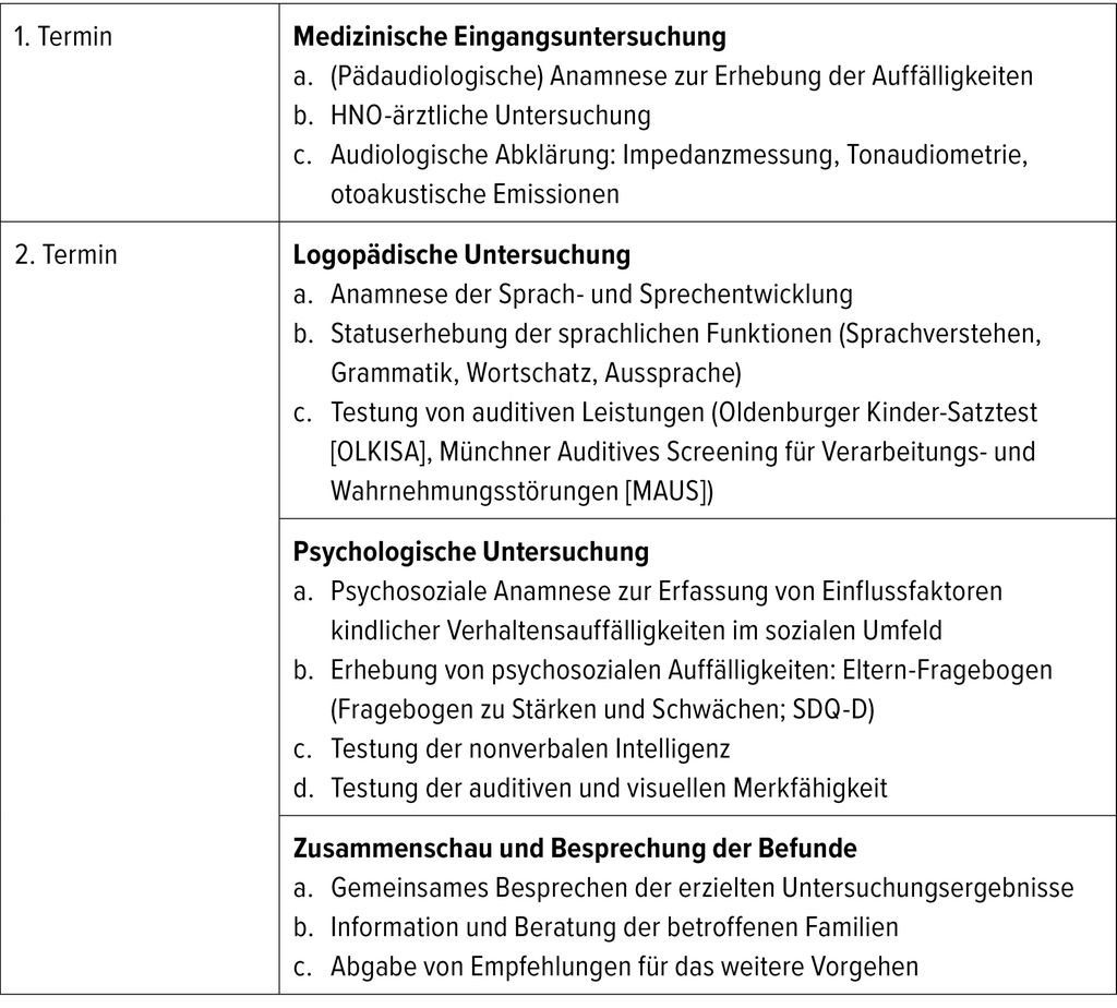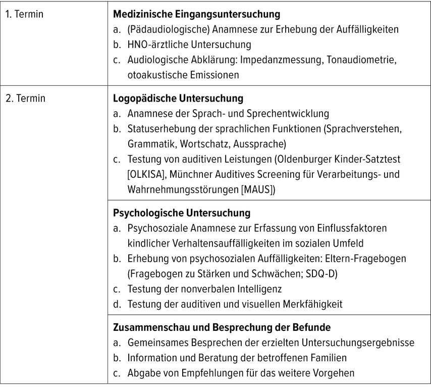 interdisziplinäre und multiprofessionelle Abklärung (Audiologie, Logopädie, Medizin, Psychologie),