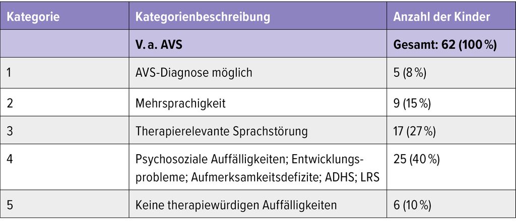 Von Jänner 2022 bis Dezember 2025 wurden 62 Kinder im Volksschulalter mit der Fragestellung AVS nach dem dargestellten Schema von uns untersucht. Dabei zeigte sich, dass die betroffenen Kinder im Wesentlichen in die folgenden 5 Kategorien eingeteilt werden konnten: