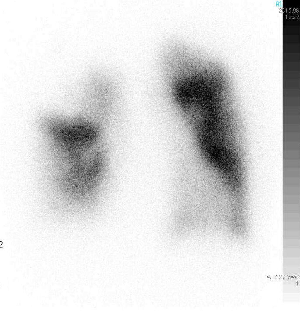 Abb. 2: Anterior-posteriores Projektions-Bild einer Perfusionsszintigraphie bei Chronisch Thromboembolischer Pulmonaler Hypertension (CTEPH). Es zeigen sich typische keilförmige Defekte. Die dazugehörige Ventilationsszintigraphie ist normal, und wird oft übersprungen. Die Perfusionsszintigraphie ist der sensitivste Screeningtest für CTEPH, beweist aber die Erkrankung nicht.