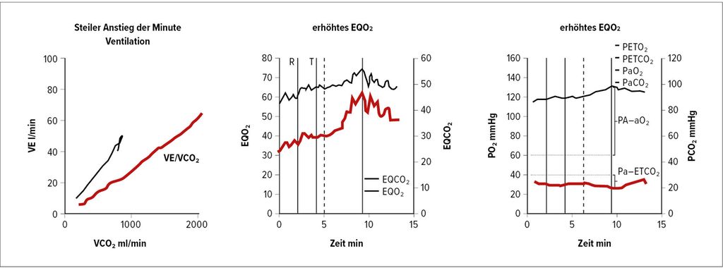 Abb. 1: Von links nach rechts Panels 4, 6 und 9 der Wassermannplots bei Lungengefäßerkrankung. In der Abbildung zeigen rote Kurvenlinien die Lungengefäßerkrankung an, die schwarzen Kurven stammen von normalen Kontrollen. EQO2 steht für ventilatorisches Sauerstoff-Äquivalent berechnet als Atemminutenvolumen/Sauerstoffaufnahme (VO₂), PETCO₂ steht für endtidales CO₂