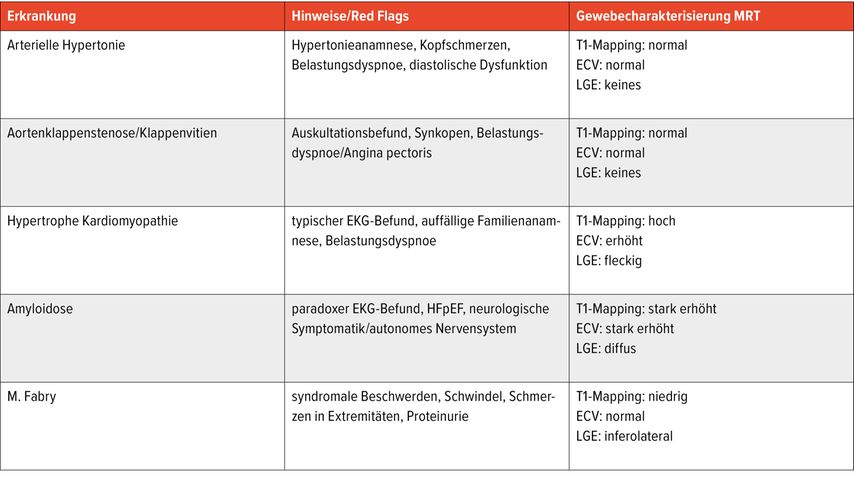 Die Linksventrikelhypertrophie ist ein sehr häufiger Befund bei internistischen Patient:innen. Symptomatik und Red Flags können auf eine spezifische zugrunde liegende Erkrankung hinweisen. Die kardiale Bildgebung mittels Echokardiografie und MRT dient der Objektivierung des Verdachts und der Differenzialdiagnose. Meist gelingt eine Diagnosestellung nichtinvasiv in Zusammenschau mit Laboruntersuchungen, molekulargenetischen Bestimmungen und Knochenszintigrafie. Für HCM/HOCM, ATTR-Amyloidose und M.Fabry stehen spezifische Therapien zur Verfügung, die, in Kombination mit adäquater Risikostratifizierung und regelmäßigen Kontrollen, die Lebensqualität und Prognose der Patient:innen entscheidend verbessern können.