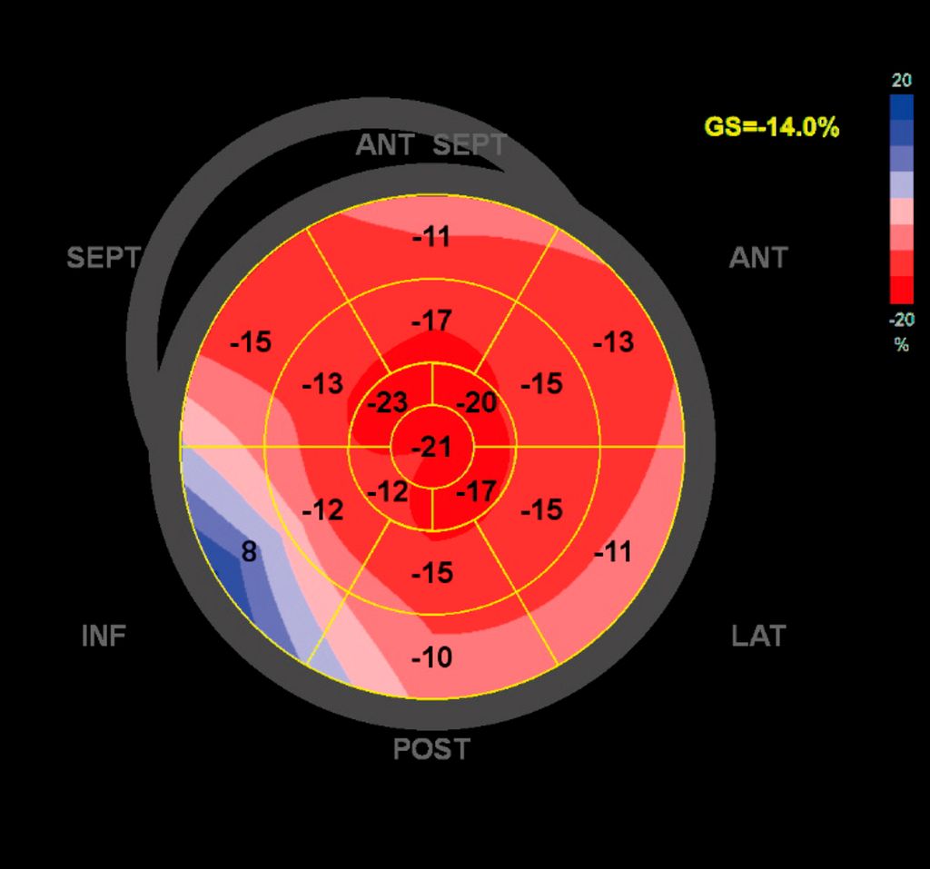 Dennoch ist die Echokardiografie aufgrund der niederschwelligen Verfügbarkeit als erste Untersuchungsmodalität und zur Verlaufsbeurteilung nicht wegzudenken. Mit der Ejektionsfraktion, der Vorhofgröße und der Beurteilung der diastolischen Funktion können prognostisch wichtige Parameter erhoben werden. Ein „apical sparing“ in der Analyse des myokardialen Strains oder der Aspekt eines „granular sparkling“ kann einen Verdacht auf kardiale Amyloidose begründen (Abb.3). Jede echokardiografische Untersuchung wegen des Verdachts auf LVH sollte außerdem eine Bestimmung des LVOT-Gradienten inkl. Valsalva-Manöver beinhalten (Abb.2).