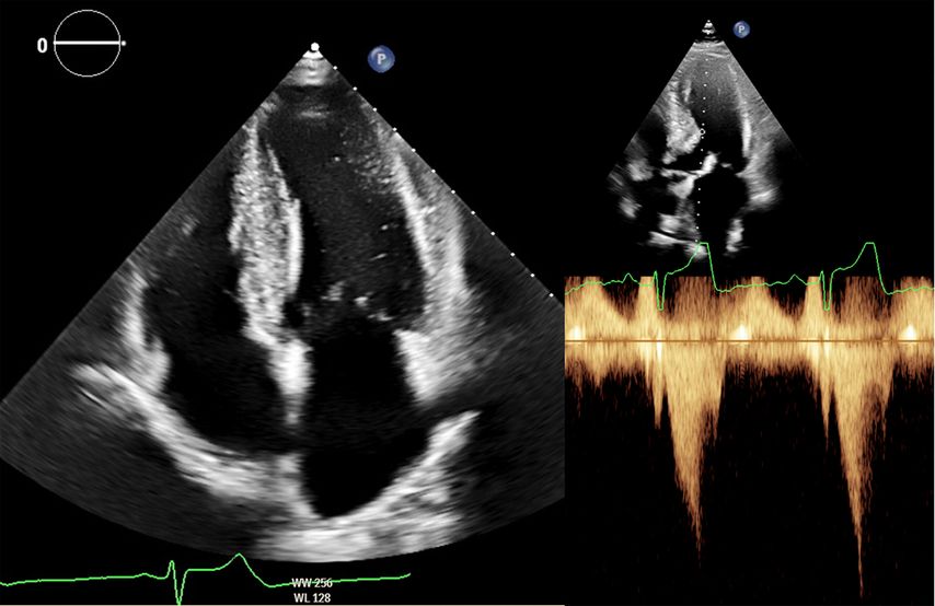 Abb. 2: Echokardiografie bei HOCM mit 4-Kammer-Blick (links) und Obstruktion im Ausflusstrakt (rechts)