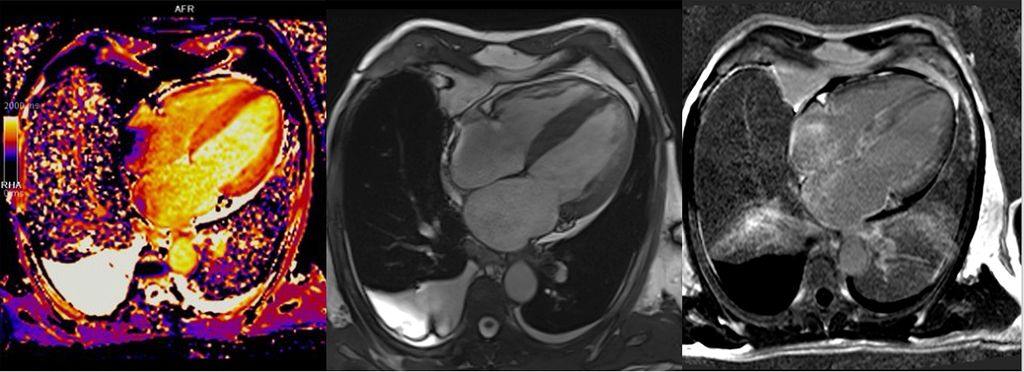 Abb. 4:Kardiale MRT bei ATTR-Amyloidose: erhöhtes T1-Mapping (links), 4-Kammer-Bick mit Hypertrophie (Mitte), diffuses subendokardiales LGE (rechts)