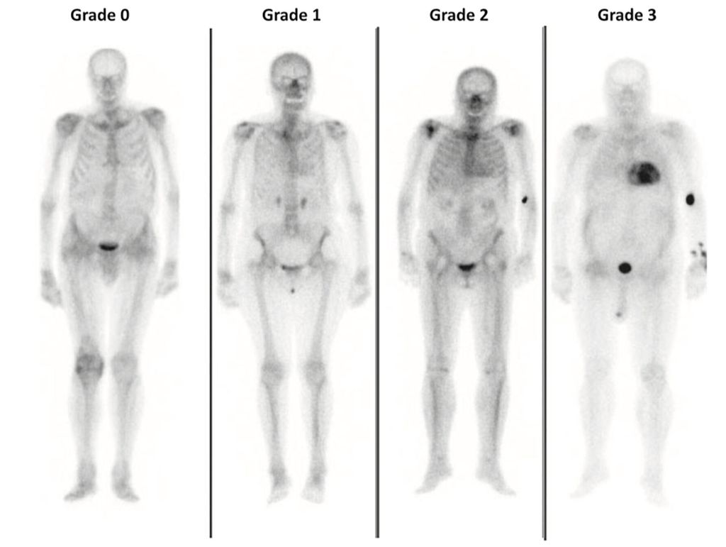 Abb. 5:Knochenszintigrafie mit Perugini-Score 0 (links) bis 3 (rechts; aus Garcia-Pavia P et al. 2021)9