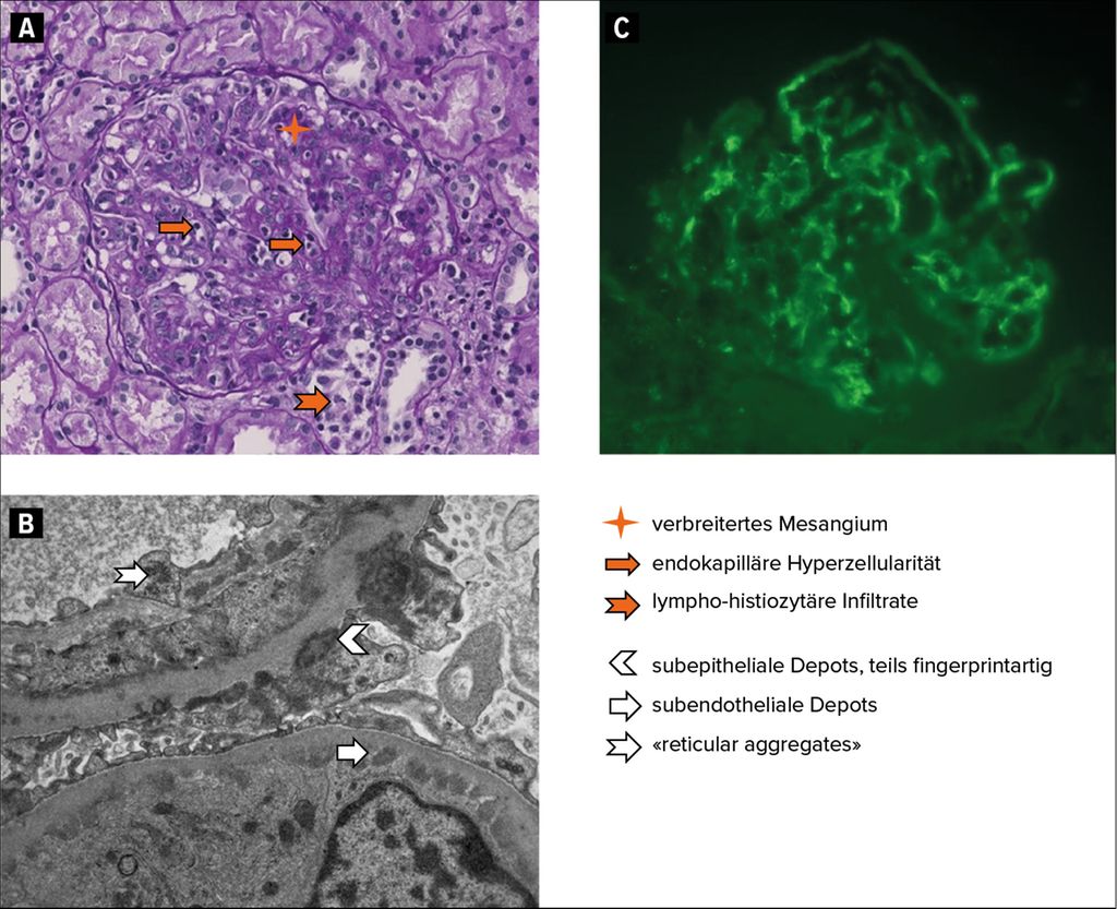 Abb. 1: Die histologischen Schnitte zeigen eine Lupusnephritis Klasse IV und V mit (A) endokapillärer Hyperzellularität und einem interstitiellen lymphohistiozytären Infiltrat in der Lichtmikroskopie (LM) und (B) klassischen subendothelialen und subepithelialen elektronendichten Depots sowie «reticular aggregates» in der Elektronenmikroskopie (EM). (C) Exemplarisch für die starke Positivität der Immunfluoreszenz (IF) in allen Untersuchungen (IgG, IgA, freie Leichtketten Kappa und Lambda, Komplementfaktor C3 und Antigen C1q entsprechend dem klassischen «full house» Muster) die IF für IgG