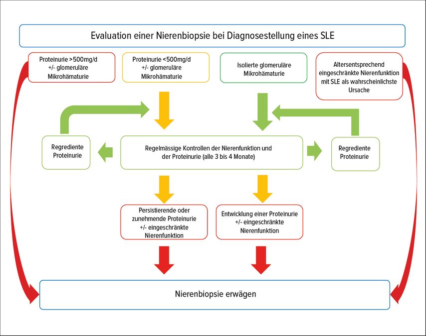 Entsprechend sollte die Entscheidung zur Nierenbiopsie mehr auf einer individualisierten Basis als anhand von einzelnen klinischen Parametern getroffen werden. Ein möglicher Algorithmus zum Zeitpunkt der Diagnosestellung ist in Abbildung 2 abgebildet. Wichtige weitere Zeitpunkte zur Evaluation einer Nierenbiopsie sind neben der Diagnosestellung des SLE ein fehlendes klinisches Ansprechen auf die Therapie 3 und 12–18 Monate nach Therapiebeginn.11