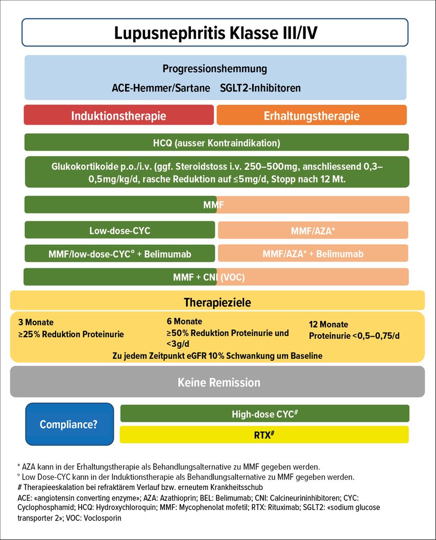 Neben HCQ richtet sich die Wahl der immunsuppressiven Therapie nach der Art und der Schwere der Organbeteiligung. Liegt eine LN vor, wird die Wahl der immunsuppressiven Therapie häufig hierdurch bestimmt. Eine LN Klasse I und II wird in der überwiegenden Mehrheit nicht mit einer immunsuppressiven Therapie behandelt, sondern mit generellen supportiven Massnahmen (optimale Kontrolle der kardiovaskulären Risikofaktoren, Reduktion der Proteinurie). Eine Ausnahme stellt ein begleitendes nephrotisches Syndrom dar, da in diesem Fall das Vorliegen einer Lupuspodozytopathie angenommen wird, die entsprechend einer «minimal change disease» mit hoch dosierten Steroiden behandelt werden sollte.