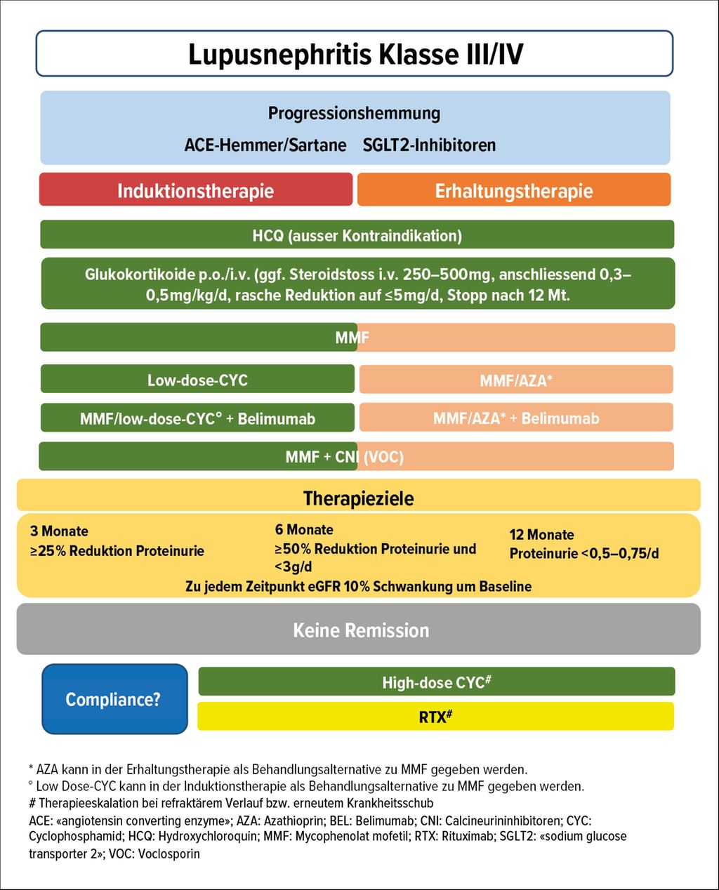 Für eine LN Klasse III und IV wird neu eine multimodale Kombinationstherapie empfohlen. Mycophenolat mofetil (MMF) und Steroide bleiben als Basis die empfohlene Erstlinientherapie und können individualisiert entweder mit Cyclophosphamid (CYS), Belimumab oder Voclosporin ergänzt werden. Voclosporin ist nur in Kombination mit MMF zugelassen. Belimumab kann als 3-fach-Therapie entweder mit MMF oder CYS kombiniert werden (Abb. 3).5