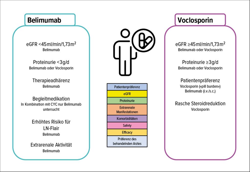 Abb. 4: Wahl der Multitargettherapie. Gegenüberstellung der aktuell zur Verfügung stehenden Behandlungsalternativen für den Einsatz einer Multitargettherapie. Bevorzugter Einsatz von Belimumab bei einer glomerulären Filtrationsrate (eGFR) von <45ml/min/1,73m2, verstärkter extrarenaler Aktivität, einem erhöhten Risiko für einen Lupusschub sowie bei Adhärenzproblemen. Bevorzugte Gabe von Voclosporin bei einer Proteinurie >3g/d sowie der Notwendigkeit einer raschen Steroidreduktion (adaptiert nach Frangou E et al. 2024)23