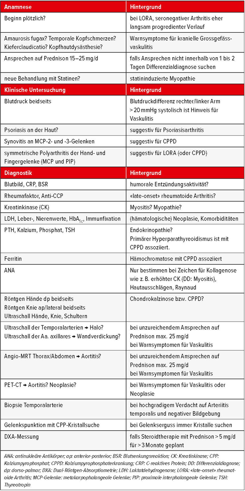 Bei PMR kommt es typischerweise zu einem raschen Ansprechen auf Prednison in einer Dosis von <25mg/d innerhalb von ein bis zwei Tagen. Bleibt dieses Ansprechen aus, sollte nach anderen Diagnosen, insbesondere Grossgefässvaskulitis, Neoplasien oder Infekten gesucht werden. Eine Temporalarterienbiopsie kann bei hohem Verdacht auf kranielle Grossgefässvaskulitis, aber negativer Bildgebung sinnvoll sein. Die wichtigsten Differenzialdiagnosen samt Checkliste zur Suche danach sind in Tabelle 2 zusammengefasst.