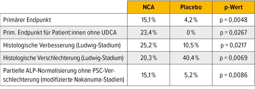 Zur primär sklerosierenden Cholangitis (PSC), für deren Behandlung es bislang keine etablierte medikamentöse Therapie gibt, präsentierte Trauner beim EASL die Ergebnisse der Phase-III-Studie NUC-5 mit Norucholsäure (NCA), einem semisynthetischen Gallensäurederivat.6 301 Patien-t:innen mit PSC und erhöhter ALP (≥1,5-mal „upper limit of normal“;ULN) erhielten in dieser Studie entweder 1500mg NCA oder Placebo einmal täglich p.o. für insgesamt 192 Wochen. In Hinblick auf den primären Endpunkt (AP<1,5-malULN, keine histologische Verschlechterung anhand der Klassifikation nach Ludwig vs. Baseline) zeigte sich bei der Datenanalyse nach 96 Behandlungswochen eine signifikante Überlegenheit von NCA gegenüber Placebo bei gleichzeitig hervorragendem Sicherheitsprofil (Tab.1). Nach 96 Wochen erreichten 15,1% der mit NCA behandelten Patient:innen den primären Endpunkt vs. 4,2% unter Placebo (p=0,0048) in der „Intention to treat“-Analyse, in der Patient:innen ohne Follow-up-Leberbiopsie als Therapieversager klassifiziert wurden. Wurden nur Patient:innen ohne fehlende Biopsien/Follow-up-Daten berücksichtigt, lag die Ansprechrate bei 21,7% (gegenüber 5,7% unter Placebo). Interessanterweise wurde eine höhere Ansprechrate auf NCA auch bei Patient:innen ohne begleitende UDCA-Therapie beobachtet (Tab.1). Bei 25,2% in der NCA-Gruppe verbesserte sich die Fibrose um mindestens ein Ludwig-Stadium vs. 10,5% unter Placebo (p=0,0217). Eine Verschlechterung um mindestens ein Ludwig-Stadium trat bei 20,3% der NCA-Gruppe vs. 40,4% unter Placebo auf (p=0,0069). Aufgrund dieser Daten wurde bereits die Zulassung von NCA für die Therapie der PSC beantragt. Weitere Ergebnisse sind nach Abschluss der gesamten 192 Wochen der NUC-5 Studie zu erwarten. Trauner: „Neben der Verbesserung der Patientenversorgung liefert diese Studie auch neue Erkenntnisse, die uns helfen, die Krankheit selbst besser zu verstehen.“