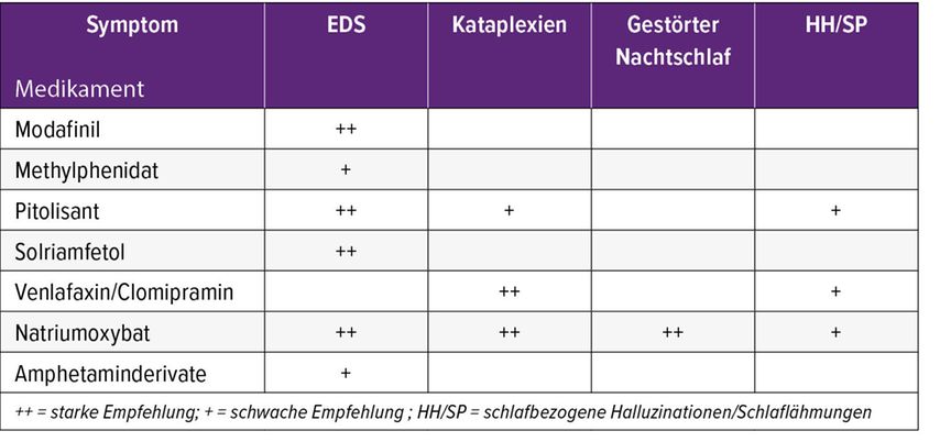 Tab. 2: Pharmakotherapie der Narkolepsien (bei Erwachsenen), adaptiert nach Bassetti, Kallweit et al. 202110