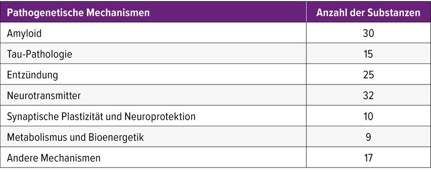 Die meisten untersuchten Substanzen adressieren die in Tabelle 1 angegebenen pathogenetischen Mechanismen.