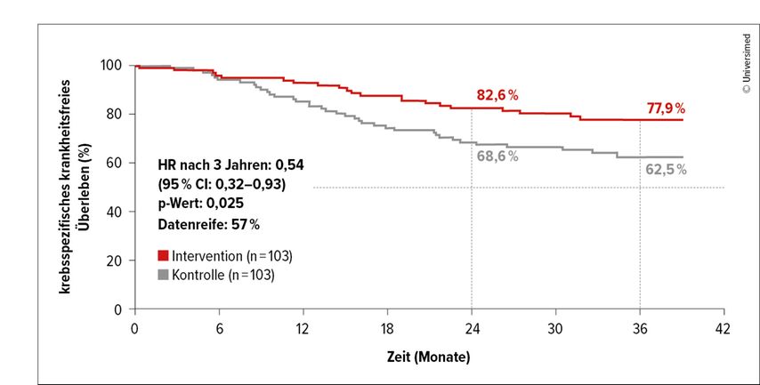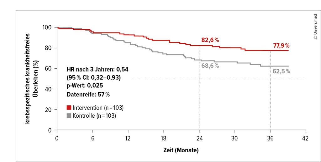 Im Prüfarm (n=103) gelangte Nivolumab alle drei Wochen plus Chemotherapie über vier Zyklen, gefolgt von sechs Zyklen einer Nivolumab-Erhaltung, zur Anwendung, im Kontrollarm (n=103) die Chemotherapie alleine. Hinsichtlich des als primärer Endpunkt definierten krankheitsfreien Überlebens (DFS) war der Median in beiden Armen noch nicht erreicht, jedoch wurde bereits eine relevante Abnahme der Rezidivneigung im Prüfarm mit DFS-Raten von 73,3% vs. 59,9% nach 36 Monaten evident (HR: 0,65; p=0,085). Laut einer krebsspezifischen Sensitivitätsanalyse betrugen die DFS-Raten nach 36 Monaten 77,9% vs. 62,5% (HR: 0,54; p=0,025; Abb.1). Eine Analyse ab dem Tag 90 nach Tumorresektion ergab einen signifikanten Vorteil der Chemoimmuntherapie mit 36-Monats-Raten von 74,7% vs. 60,1% (HR: 0,60; p=0,048).