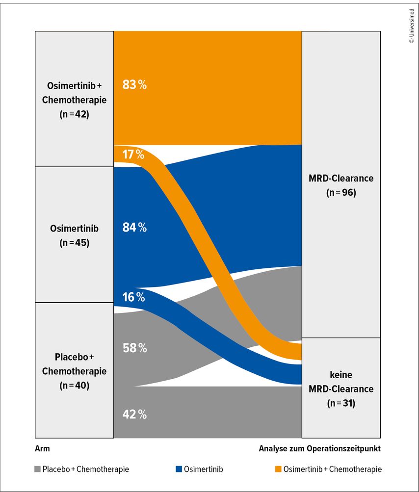 Patient:innen, die zu Studienbeginn MRD-negativ waren, blieben länger ereignisfrei: Nach 18 Monaten betrug die EFS-Rate in dieser Population 96% vs. 82% in der ursprünglich MRD-positiven Gruppe. Als MRD-Clearance war eine ctDNA-Reduktion um den Faktor 10 bzw. MRD-Negativität vor der Operation nach initialer MRD-Positivität definiert. Eine MRD-Clearance trat hauptsächlich unter den Osimertinib-basierten Therapien ein (Abb. 2) und ging im Gesamtkollektiv mit einer signifikant höheren MPR-Rate einher als eine fehlende Clearance (24% vs. 6%; p=0,0378).