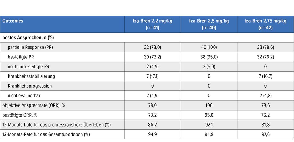 Die Effektivitätsdaten weisen auf eine vielversprechende präliminäre Antitumoraktivität hin. Unter der 2,5-mg/kg-Dosis betrug die ORR 100%; nach zwölf Monaten lebten 94,8% der Patient:innen, und 92,1% waren progressionsfrei (Tab. 1). 85,4% der mit den Dosen 2,2–2,75mg/kg Behandelten erfuhren ein objektives Ansprechen. Die mediane Ansprechdauer war zum Analysezeitpunkt noch nicht erreicht worden. In China prüft derzeit eine Phase-III-Studie Iza-Bren in der Dosis 2,5mg/kg an den Tagen 1 und 8 eines dreiwöchigen Zyklus plus Osimertinib als Erstlinientherapie des EGFR-mutierten NSCLC.