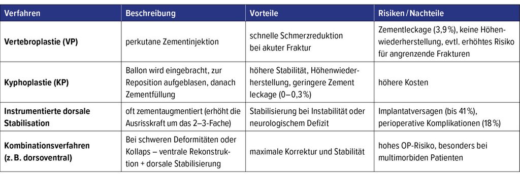 Die Wahl der operativen Technik bei OVF ist individuell abhängig vom Frakturtyp, neurologischen Status, Allgemeinzustand und Begleiterkrankungen. Minimalinvasive Verfahren (VP/KP) sind gut für die Schmerzkontrolle in der akuten Phase geeignet, während instrumentierte Stabilisationen für komplexe Fälle mit Instabilität und Deformität notwendig sind.