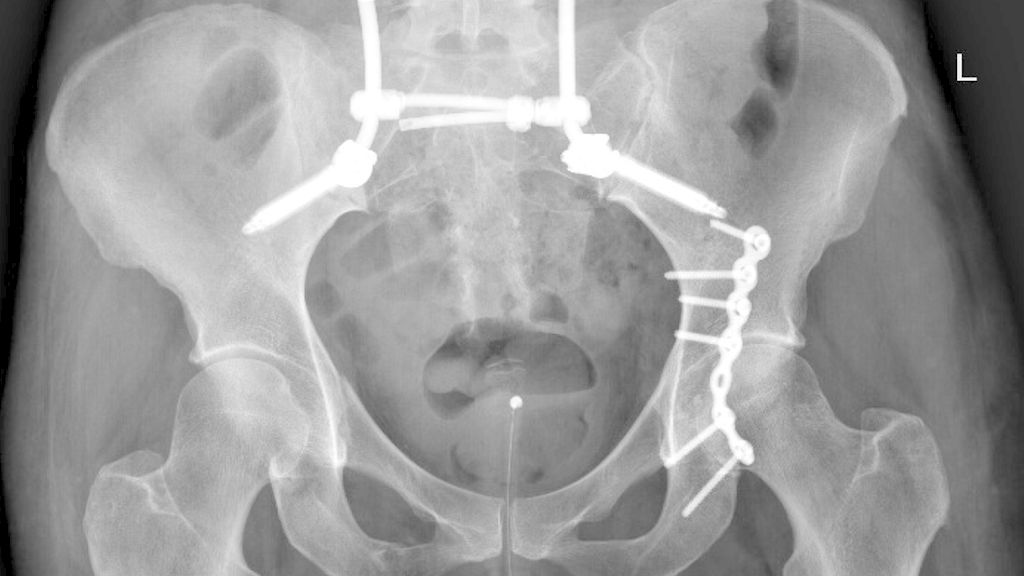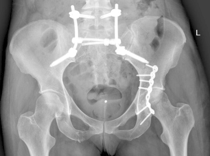 Abb. 1: Beckenübersicht einer 48-jährigen Patientin mit lumbopelviner Stabilisierung und Acetabulumplattenosteosynthese nach Sturz aus großer Höhe mit lumbopelviner Dissoziation und mehrfragmentärer transforamineller Frakturkomponente, oberer und unterer Schambeinastfraktur rechts und Acetabulumfraktur links