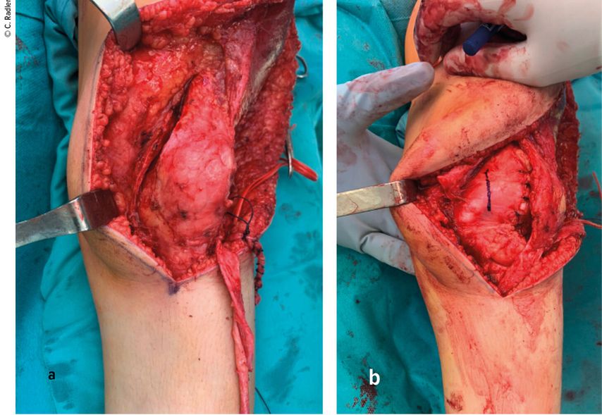 Bei der modifizierten Operation nach Langenskiöld wird die Gelenkkapsel medial und lateral der Patella inzidiert und der Vastus-medialis-Ansatz von der Patella gelöst. Die Synovia muss dabei intakt gelassen werden. Die Kapsel wird medial auf Höhe des Gelenkspaltes transversal eingeschnitten (Abb. 5a). Die gesamte Synovia wird sorgfältig von der Kapsel getrennt. Zur Korrektur der Lateralisation des Ansatzes wird die Patellasehne am Tuberculum im Sinne einer Korrektur nach Grammont scharf abgelöst und nach medial verschoben. Dabei darf weder nach zu distal geschnitten werden, um die Sehne nicht gänzlich abzulösen, noch zu tief, da dies die Apophyse verletzen könnte. Schließlich wird die Synovia um die Patella herum inzidiert und von der Synovia gelöst. Die zurückbleibende Öffnung wird dicht vernäht und sodann wird im Bereich der Notch eine neue und physiologische Position für die Patella gefunden (Abb.5b). Hier wird nun die Patella über die Synovia eingenäht. Allein dieser Schritt führt zu einer beeindruckenden Primärstabilität. Im letzten Schritt wird die mediale Kapsel mit dem Vastus medialis an beziehungsweise auf der Patella fixiert und der mediale Teil der Patellasehne an die Tuberositas tibiae medialisiert vernäht. Diese extrem effektive OP-Technik kann auch bei anderen habituellen Patellaluxationen, auch bei Vorliegen einer dysplastischen Notch, durchgeführt werden.7