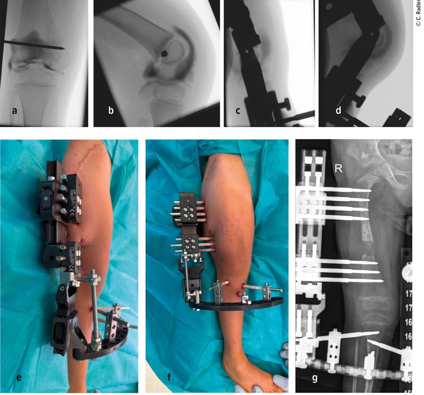 Abb. 4: Platzierung (a–d) eines Fixateur externe mit Knie-Überbau (e–g) zum Schutz vor (Sub-)Luxation