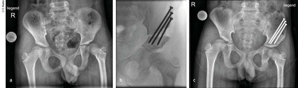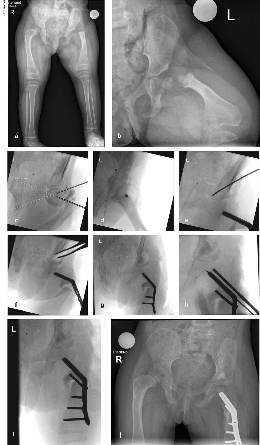 Es wird dann auf die Beckenschaufel zugegangen und hier die Apophyse gesplittet und abgelöst. Dieser sogenannte Abductor-Slide entspannt weiter die kontrakte Muskulatur, da vor der Rückvernähung der Apophyse ein Teil des Beckenkamms abgetragen wird. Erst jetzt wird an das Femur herangegangen. Da besonders bei schweren Fällen an der Hüfte nur der Hüftkopfkern sichtbar ist, muss eine Arthrografie durchgeführt werden, um ein Setzen der Bohrdrähte für die Platte zu ermöglichen. Ein erster Bohrdraht wird vom palpierten Trochanter major in das Zentrum des Hüftkopfkernes gesetzt. Ein zweiter Bohrdraht wird etwa in 45° zu diesem wiederum in das Zentrum des Hüftkopfkerns gesetzt. Die Lage des Bohrdrahtes wird im Bildwandler überprüft und kann im seitlichen Strahlengang durch die Überlappung von Hüftkopfkern, Schenkelhals und Kapsel bestätigt werden. Dann kann die Platte schließlich über diesen eingebracht werden. Die Osteotomie des Femurs erfolgt dann in 90° zur liegenden Platte und wiederum in 90° zu diesem Schnitt. Medial muss auch das Periost durchtrennt und releast werden. Nun zeigt sich bereits, wie sehr das Femur verkürzt werden muss, um spannungsfreie Korrekturen zu ermöglichen. Die Platte wird jedoch erst nach der Acetabuloplastik fixiert, um Länge und Rotation korrekt einstellen zu können. Die Acetabuloplastik wurde klassisch als modifizierte Dega-Osteotomie durchgeführt, wobei sich über eine unikortikale Iliumosteotomie („Paley unicortical ilium osteotomy“) eine bessere Überdachung erreichen lässt.