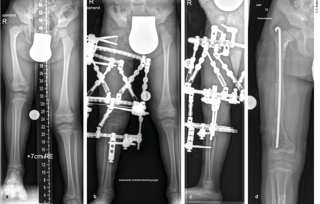 Der kongenitale Femurdefekt ist eine der spannendsten und komplexesten angeborenen Fehlbildungen in der Kinderorthopädie und in der klinischen Präsentation sehr vielgestaltig. Während auf den ersten Blick die Verkürzung des Beins/des Femurs augenscheinlich ist, sind es die assoziierten Veränderungen an Hüfte und Kniegelenk, welche die Therapie herausfordernd machen und vor einer Verlängerung adressiert werden müssen.
