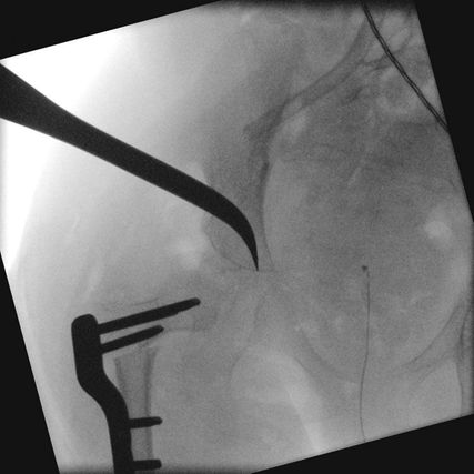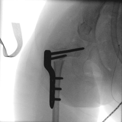Abb. 1: Hüftrekonstruktion mit VDRO, Dega-Beckenosteotomie und medialer Hemiepiphysiodese durch die Positionierung einer langen Schraube in den kaudalen Anteil der Femurepiphyse
