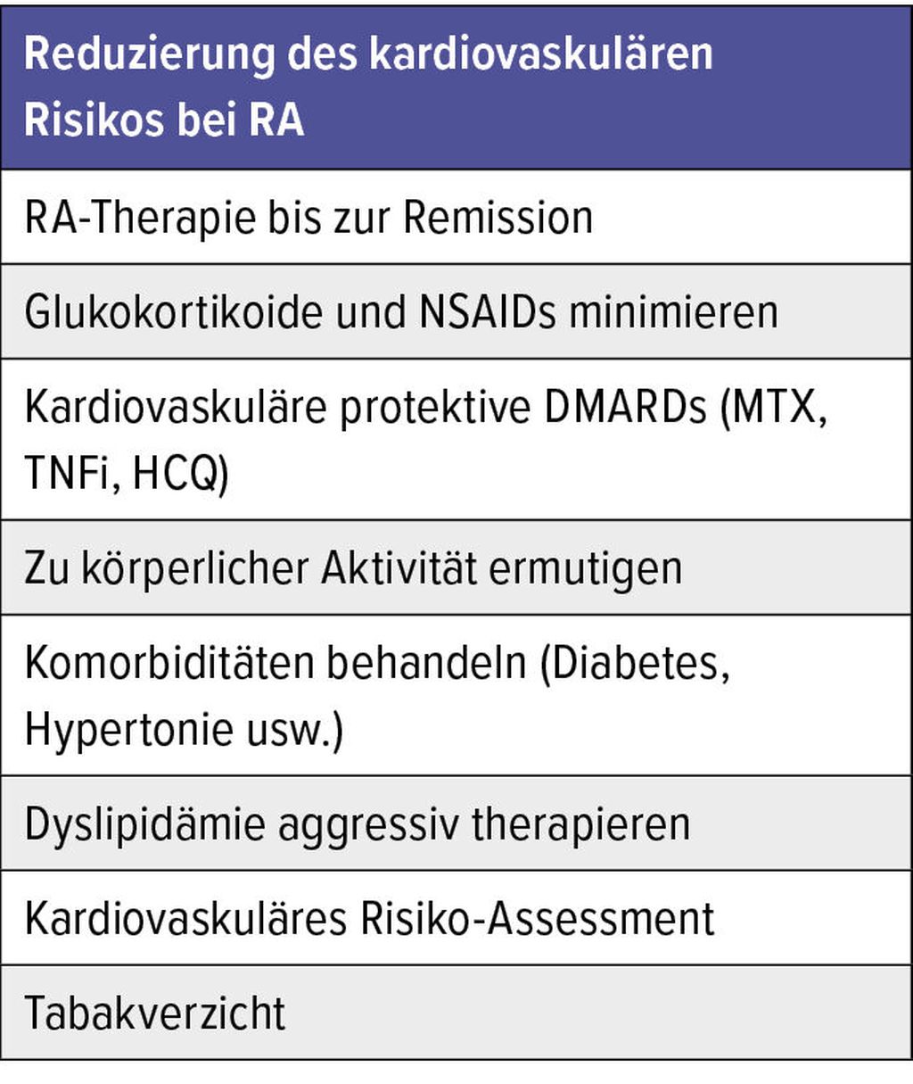 Tab. 1: Eine adäquate Kontrolle der Grunderkrankung und kardiovaskulärer Risikofaktoren reduziert das kardiovaskuläre Risiko bei RA16