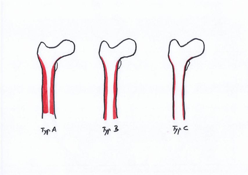 Dorr et al.17,18 entwickelten 1993 eine Einteilung in drei Femurtypen, um röntgenologisch eine Einschätzung der Knochenqualität zu ermöglichen (Abb.1). Der Dorr-Typ A zeigt einen schmalen Diaphysenkanal und wird auch als «Champagnerflöte» bezeichnet. Dieser Typ wird häufiger bei jüngeren, schwereren und männlichen Patienten beobachtet. Der Typ B ist durch eine Reduzierung der medialen und dorsalen Kortikalis gekennzeichnet, was zu einer Verbreiterung des Diaphysenkanals führt. Dieser Femurtyp kommt häufiger bei Männern als bei Frauen vor. Der Dorr-Typ C wird auch als «Ofenrohr» bezeichnet und ist durch einen breiten Kanaldurchmesser charakterisiert, der häufiger bei dünneren, älteren weiblichen Patienten auftritt. Die Inzidenz periprothetischer Frakturen ist bei Patienten mit Dorr-Typ C deutlich erhöht. Gkagkalis et al.19 stellten im Rahmen einer Multicenterstudie fest, dass bei Implantation einer Kurzschaftprothese und Vorliegen eines Dorr-Typs C die Inzidenz einer periprothetischen Fraktur um über 20% erhöht ist.