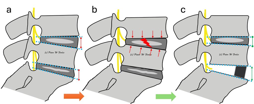 Abb. 1: Schematische Darstellung von Kompensationsmechanismen (a) mit unphysiologischen Belastungen (b) im kranialen Nachbarsegment bei segmentaler hypolordotischer Deformität L5/S1 sowie Reduktion derselben bei Wiederherstellung der Lordose durch interkorporelle Fusion (c)