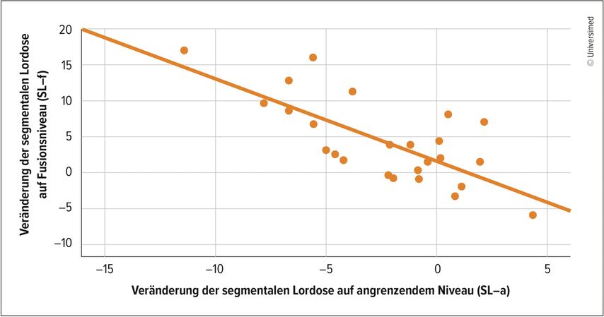 Abb. 2: Signifikante Korrelation zwischen der Wiederherstellung der Lordose im fusionierten Segment L5/S1 und der Abnahme der kompensatorischen Hyperlordose im kranialen Nachbarsegment
