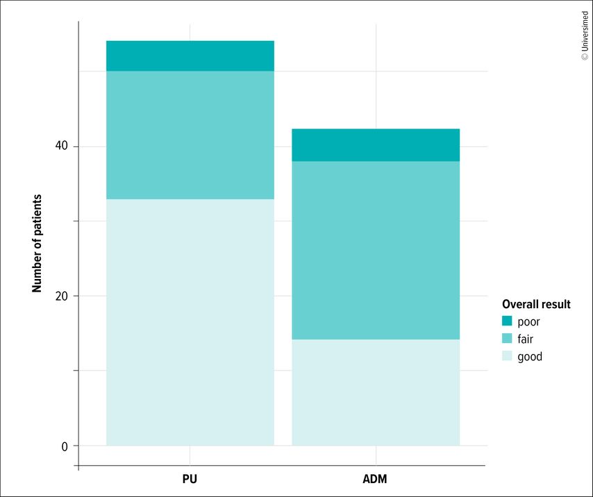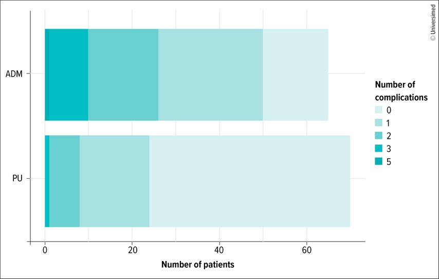 Regarding overall burden, the PU group more commonly experienced an uncomplicated course (74.3% vs 36.9%); in the ADM group, cases with 3–4 concurrent events were observed, whereas none occurred in the PU cohort (Fig.1).
