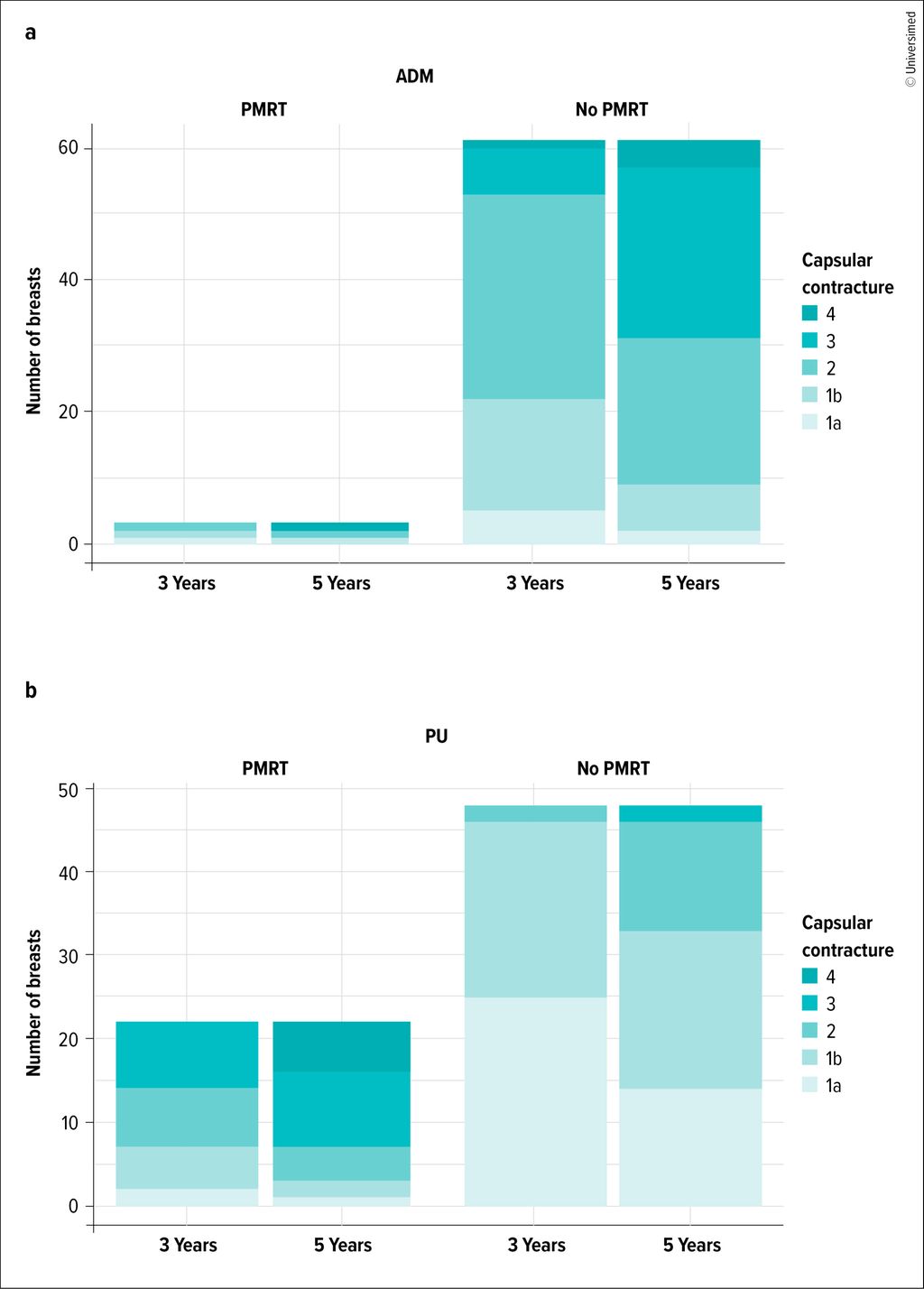Fig. 2: Graph illustrating the progression of capsular contracture at 3 and 5 years in the acellular dermal matrix group (ADM; a) and in the polyurethane group (PU; b), with and without postmastectomy radiotherapy (PMRT)