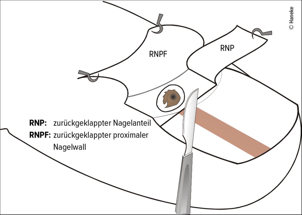 In Blockanästhesie wird ein bogenförmiger Schnitt am Rand der Exostose vorgenommen und diese vom Weichgewebe sorgfältig und großzügig abpräpariert. Eine spitz zulaufende Nagelzange eignet sich hervorragend zur Entfernung der Exostose vom Knochen, eventuelle Reste können mit einem Luer entfernt werden, um eine glatte Oberfläche zu erhalten; auch kleinste Residuen können zum Rezidiv führen. Die über der Exostose liegende Haut des ehemaligen Nagelbetts ist meist pergamentartig verdünnt und kann entfernt werden. Die Zehenspitzenhaut lässt sich mit transungualen Nähten sehr gut adaptieren. Das funktionelle und ästhetische Resultat ist hervorragend.1