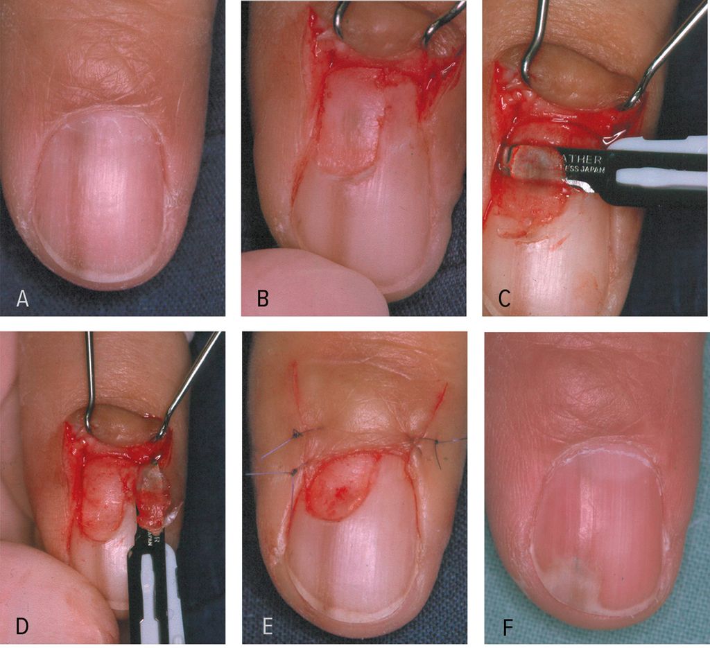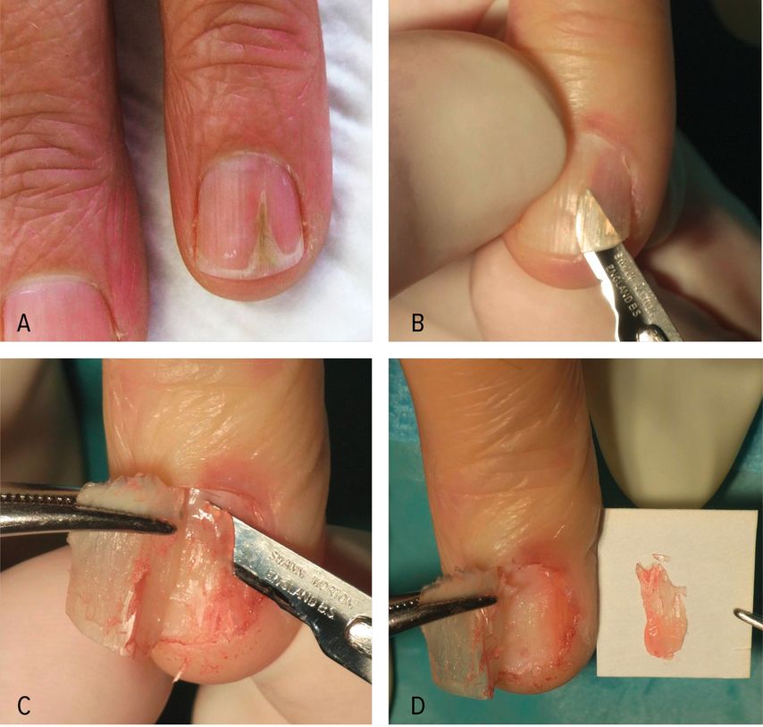 Für den seitlichen Nagel einschließende Veränderungen eignet sich die laterale longitudinale Nagelbiopsie, die von der distalen dorsalen Falte des distalen Interphalangealgelenks bis zum Hyponychium reicht. Sie ermöglicht die Diagnose praktisch aller Erkrankungen von Nagelwall, Matrix, Nagelbett und Hyponychium. Dabei muss darauf geachtet werden, keinen lateral-proximalen Matrixanteil zu hinterlassen, der zu einem Nagelspiculum führen würde. Mit Rückstichnähten im proximalen Anteil des lateralen Nagelwalls lässt sich dieser einfach wiederherstellen.2