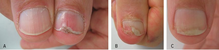 Abb. 4: Onychopapillom. A: vor der Operation; B: 3 Monate postoperativ; C: 10 Monate nach der Operation