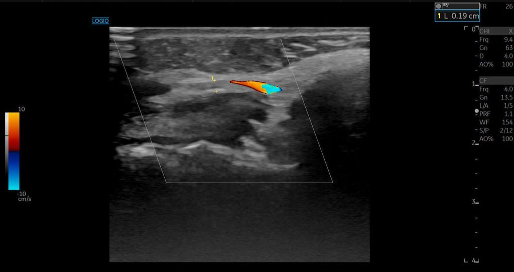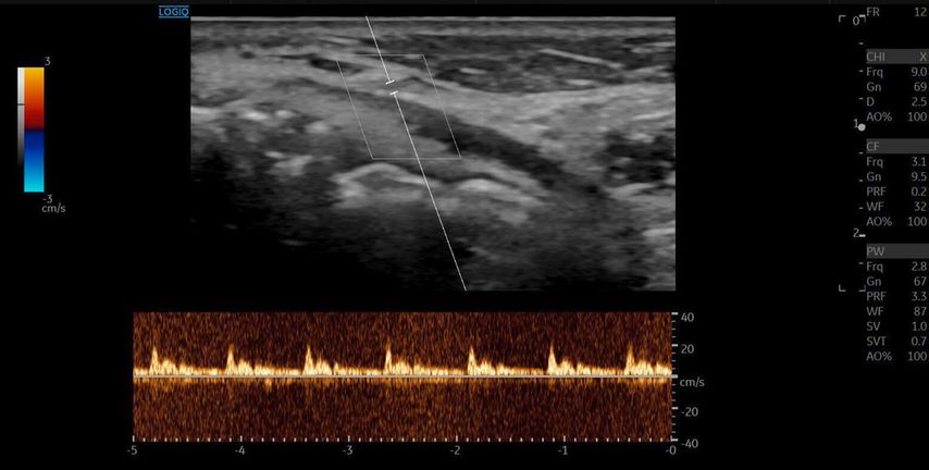 Die A. facialis imponierte beim Austritt im Bereich des Musculus masseter (oberhalb der Kieferlinie) vasospastisch mit einem maximalen Durchmesser von 1mm. Die abgeleitete systolische Spitzengeschwindigkeit betrug trotz der bestehenden Ischämie 20cm/s, ohne enddiastolische Komponente, was auf eine weitere periphere Vasokonstriktion hindeutete (Abb. 2 und 3).