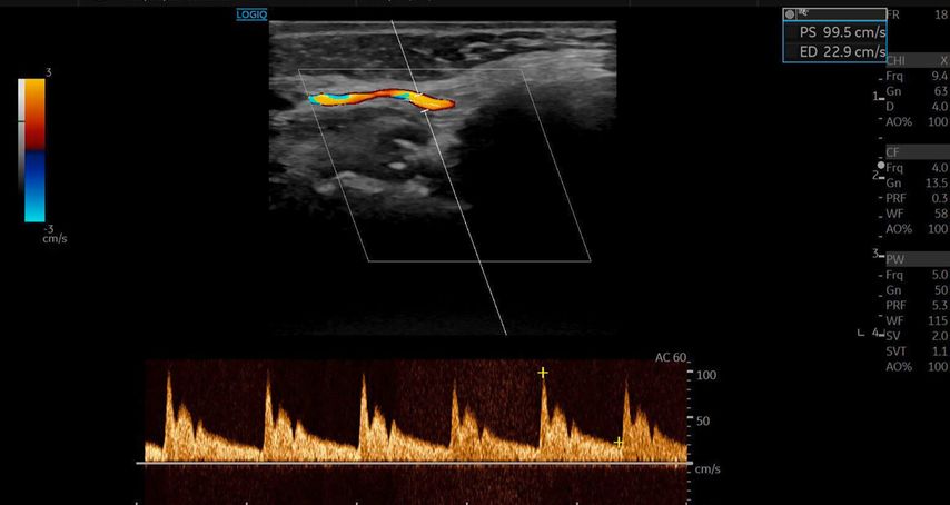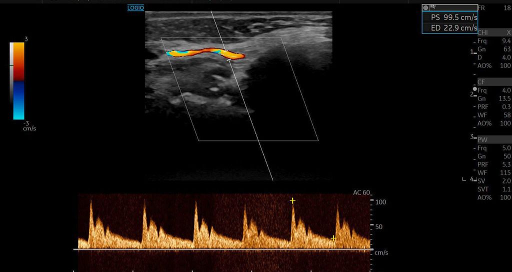 Die systolische Spitzengeschwindigkeit (PSV) stieg von 20cm/s auf über 100cm/s.