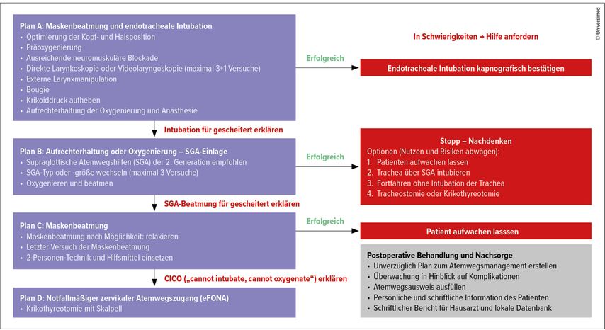 Einen gefälligen Algorithmus bietet die Difficult Airway Society (DAS) an. Er bildet einen Plan von A bis D ab, diese „4 Schubladen“ können der Reihe nach geöffnet und abgearbeitet werden (Tab.3).11,36