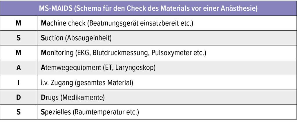 Seit der Einführung von Checklisten haben sich Fehler in Gesundheitssystemen verringert und die Patientensicherheit konnte erhöht werden. So konnte nach Etablierung von Checklisten für die Notfallintubation in Notaufnahmen und Intensivstationen eine Reduktion von Komplikationen durch die Vermeidung/Verringerung von Vorbereitungsfehlern registriert werden.4 Das technische Können und die Erfahrung werden durch Checklisten natürlich nicht beeinflusst. Atemwegsmanagement ist ein hochkomplexes Zusammenspiel von unterschiedlichen Tätigkeiten durch verschiedene Berufsgruppen mit gegenseitigem Vertrauen und damit keine Soloaktivität, sondern eine synergistische Teamarbeit, wobei die Positionierung und die einzelnen Tätigkeiten vorab besprochen werden sollten.21,22 Die Checkliste der Wahl an unserer Klinik ist MS-MAIDS (Tab.2), mit der wir seit Jahren arbeiten. Seither ist ein Respirator im Standby-Modus während der Präoxygenierung (fast) nicht mehr zu beobachten, ebenso wenig eine fehlende Aktivierung des Blutdruckmessintervalls in der Einleitungsphase.23