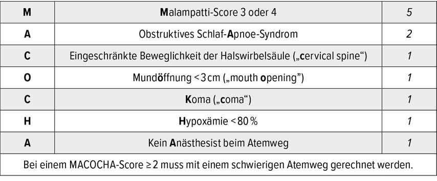 Unabhängig von diversen Scoring-Systemen, die eine Beurteilung der erschwerten Maskenbeatmung ermöglichen und eine schwierige Laryngoskopie vorhersagen, gibt es keinen Score mit einer 100%igen Sensitivität und Sensibilität.10 Ein praktischer Score zur präinterventionellen Beurteilung des Atemweges ist der MACOCHA-Score (Tab.1).4,11