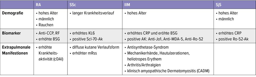 Tab. 1: Risikofaktoren für die Entwicklung einer ILD bei Kollagenosen und rheumatischen Erkrankungen